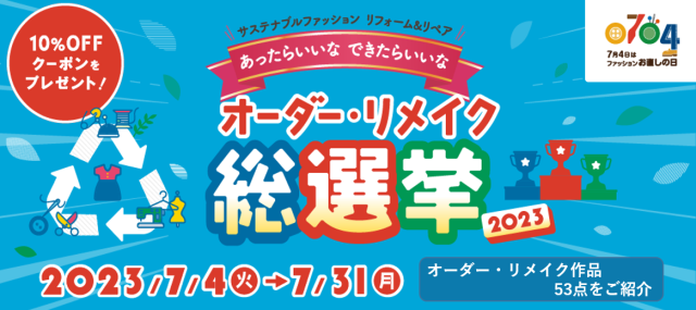 キャンペーン内容:7月4日10:00よりキャンペーンサイトにて当社マジックミシンスタッフが提案しますオーダー・リメイク作品53点をご紹介いたします。オーダー・リメイク作品に対しお客さま自身に投票いただきNo.1作品を決定しましてキャンペーンサイトにて結果発表いたします。投票いただきましたお客さまへはもれなく全国のマジックミシンで使える「洋服のお直し10%OFFクーポン」をプレゼントいたします。